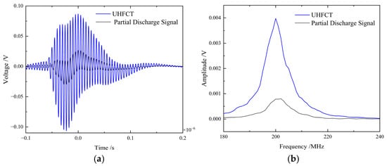 (a) Time-domain comparison waveform of 200 MHz partial discharge coupled signals. (b) Frequency-domain comparison waveform of coupled signals.