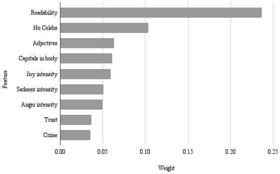 Lower levels of subjectivity and entertainment will predict higher quality, whereas higher levels of emotional content and poor language use will predict lower quality. The accuracy of the quality classification models is presented in Table 4 and the best models are XGBoost classifier and Random Forest. The preferred classifier was able to correctly classify 85% of the news articles into high- or low-quality categories based on the identified attributes. The other models achieved F1 scores ranging from 80% to 85%. To find the most important features, we used the ELI5 Python library for “Inspecting Black-Box Estimators” to get the permutation importance (Figure 1). Therefore, the accuracy of the models indicates that the theoretical quality framework is effective in Greek articles.