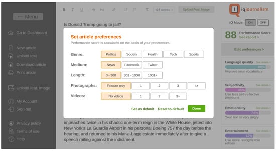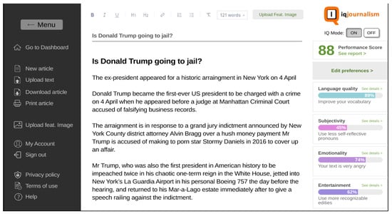 Despite the fact that there is a growing focus on developing solutions for educational use, writing enhancement, and even science fiction character creation [9,10,11,12,13,14,15], tools that specifically support the production of quality journalistic content remain limited. The IQJournalism system came to fill this gap aiming to highlight the qualitative characteristics of news stories and their capacity to increase engagement on social media. In more detail, the objectives of this approach were as follows: