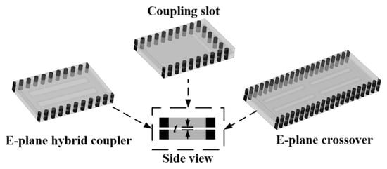 Side views of the E-plane hybrid coupler, E-plane crossover, and coupling slot.