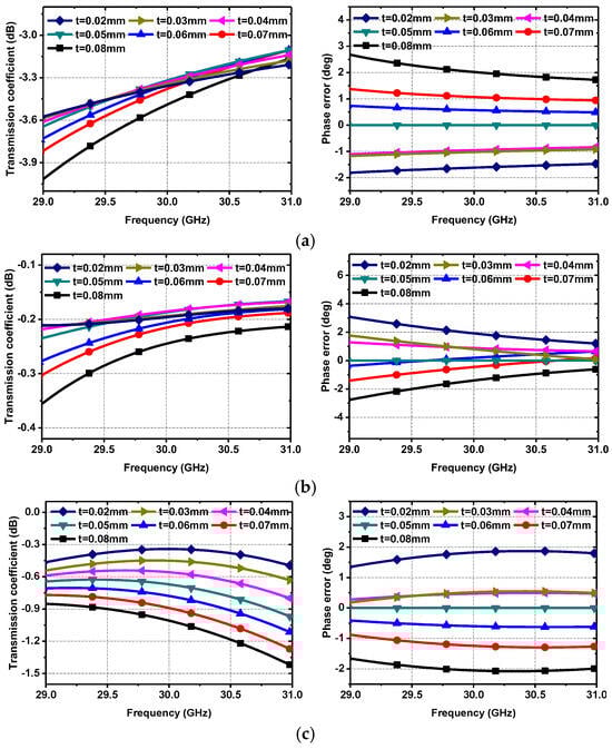 There are two major factors that take charge of the beam steering properties, i.e., the energy magnitude and the phase difference. Derived from Figure 3a,b, smaller fluctuations of transmission coefficients can be observed when t < 0.05 mm compared with when t > 0.05. Based on this characteristic, a bigger initial value of t brings a better error-tolerant rate. However, the produced phase errors corresponding to both t < 0.05 mm and t > 0.05 remain unstable. To summarize, t = 0.05 mm is set as the initial value to balance potential errors of transmission coefficient magnitude and phase difference in the simulation. Similarly, the simulated results of the coupling slot are plotted in Figure 3c. The insert loss reaches up to 1 dB at the center frequency with t = 0.08 mm, which represents that the transmission suffers from 20% energy leakage. Also, with parameter t variance, the coupling slot encounters a considerable magnitude error which restricts the magnitude’s balanced property. In conclusion, a coupling slot should be employed in LTCC technology rather than in compressive type or cohesive type multi-layer PCB technology.