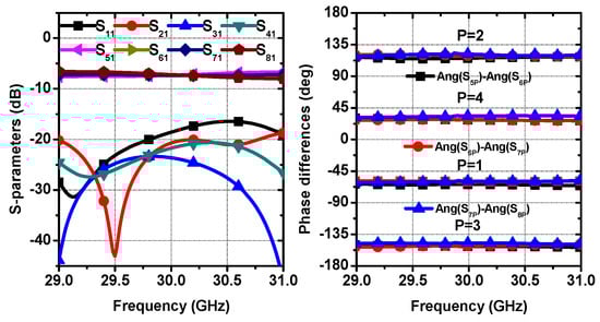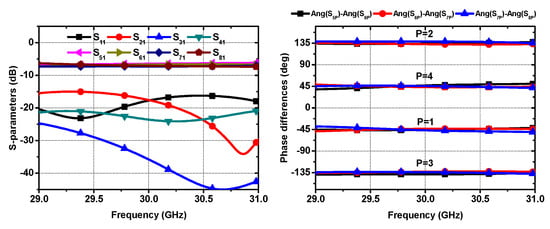 Performances of the BM are characterized by the following indexes: return loss, isolation and errors of the signal amplitude, and phase difference. The simulated S-parameters with port #1 excitation are shown in Figure 4. The results associated with other ports excitations are similar to those for port #1 excitation. As the figure shows, the reflection coefficients are below −15 dB from 29 GHz to 31 GHz, as well as the isolation coefficients. The transmission coefficients can evaluate the power division and the magnitude balance. It is seen that the amplitude generates ripples of ±0.6 dB, near −6.8 dB. These results indicate an insertion loss of approximately 0.8 dB, which can be verified by the results shown in Figure 3. Well-balanced phase differences between adjacent output ports are shown in Figure 4, i.e., ang(S5P)–ang(S6P), ang(S6P)–(S7P), and ang(S7P)–ang(S8P) are approximately −45°, 135°, −135°, and 45° for excitations from port #1 to #4 (noted as P = 1 to 4), respectively. Within the interested frequency spectrum (29 to 31 GHz), the maximum phase errors are less than ±5°. The simulated results fully confirm the validity of the application of the designed E-plane 4 × 4 BM as the BFN.