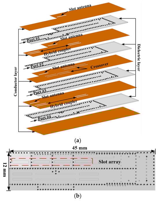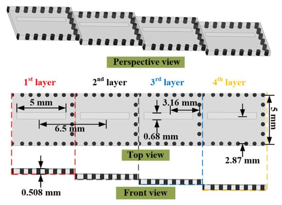 Due to its ease of integration and fabrication, a slot antenna is preferable for adoption as the radiation element in SIW technology. Several schemes of latitudinally arranged slot antenna arrays are reported in [11,12,13,18,27]. However, these slot antenna arrays suffer from severe mutual coupling effects, which deteriorates angular diversity, reduces radiation efficiency [28]. To suppress the mutual coupling effect, an unconventional ladder-type longitudinally arranged slot antenna array is presented. Referring to Figure 5, the four slot antenna elements are distributed in four separate layers to accommodate the E-plane 4 × 4 BM whose output ports are distributed in separate layers as well. Furthermore, they are arranged in the longitudinal direction for the purpose of suppressing the surface wave coupling.