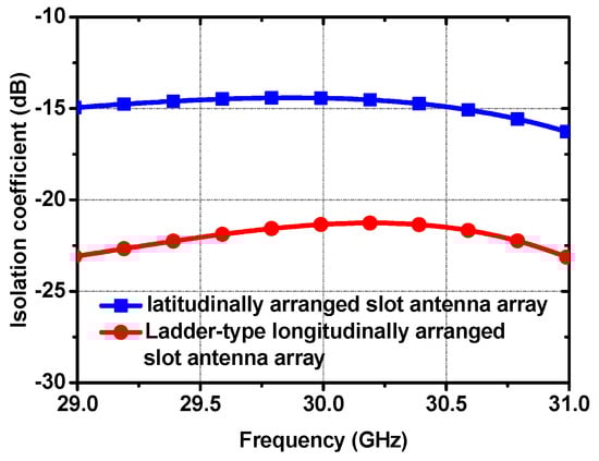The simulated results of E-field distributions and isolation coefficients are shown in Figure 6 and Figure 7. It can be observed from Figure 6 that the E-field distribution of the adjacent slot antenna in Figure 6b is much weaker than that in Figure 6a when one of the slot antennas is stimulated. Figure 7 indicates that the isolation coefficient of the ladder-type slot antenna array is much improved compared to the latitudinally arranged case, by approximately 7 dB, which verifies the validity of the mutual coupling reduction effect of the new arrangement.