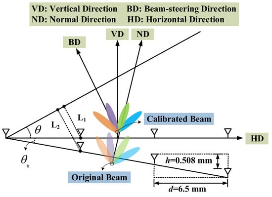 However, this new form of arrangement has raised another problem, as shown in Figure 8. Because the slot antennas are arranged on separate layers, the normal direction has a deviation angle θ0 from the vertical direction, compared with the linear array distributed in the horizontal direction. In other words, the four generated beams would have a rotation angle θ0 from the vertical direction.