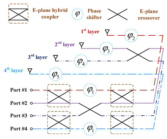 As depicted in Figure 1, the E-plane 4 × 4 BM contains E-plane couplers, E-plane crossovers and several phase shifters with fixed values. Unlike typical H-plane designs, the basic components are vertically stacked. Compared to an H-plane BM integrated into such a single layer, the E-plane BM has the ability to allocate the signal into separate layers. By doing so, the separated transmission path can be stacked up with the assistance of the closed structure of SIW, contributing to the size reduction in BM. The detailed design procedures of the basic BM components, including the E-plane coupler and phase shifter are described in [16,20,21,22,23,24,25,26]. The introduced E-plane crossover is structured by two cascaded E-plane hybrid couplers. The E-plane hybrid coupler can produce layer-to-layer coupling transmission by etching two slots on the co-plane of the upper layer and lower layer. Layer-to-layer cross transmission is realized by the implementation of an E-plane crossover. Finally, the structure of the E-plane 4 × 4 BM can be built up by four layers of laminates, each of which contains an input port and an output port.