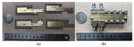 A typical 4 × 4 Butler matrix (BM) is constructed by a series of couplers and phase shifters. Additionally, several crossovers are required to address path crossings. The hybrid couplers can divide the energy equally with a phase difference of ±90°. The phase shifters are inserted to maintain the desired phase gradients at the output ports. For an H-plane BM, these basic components are usually arranged in a horizontal plane, which is common use in the open literature [11,12,13]. With the development of a 3D integration system, the vertical connection and transmission become a key challenge in system design [21]. The E-plane 4 × 4 BM, as a counterpart, consists of similar basic components in a distinguishing combination form. The basic component of the E-plane 4 × 4 BM includes the E-plane couplers, E-plane crossovers, and E-plane phase shifters, which are briefly introduced in [21,22]. On the basis of these results, the detailed structure and design process are elaborated in this paper. Furthermore, to improve performance, the impacts of air gaps are also taken into consideration.