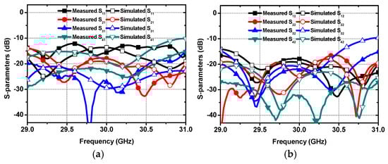 The reflection and isolation coefficients for port #1 and port #2 excitations are plotted in Figure 14a and Figure 14b, respectively, including the simulation and measurement cases. The situations for port #3 and port #4 are similar to that of port #1 and port #2 excitations. It can be seen that the reflection and isolation loss are higher than 10 dB from 29 GHz to 31 GHz. The measured and simulated results can be viewed as having acceptable agreement in consideration of the error in fabrication and measurement.