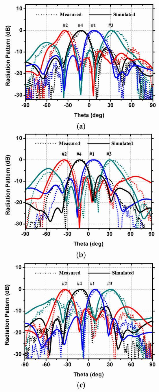 Despite the slight fluctuation of minority beams, it can be observed in Figure 15 that an acceptable agreement between simulated and measured radiation patterns is obtained. In addition to the inevitable air gap mentioned above, fabrication errors and measurement errors can also deteriorate the measured patterns. Radiation patterns at 29 GHz and 31 GHz are also included in Figure 15 to analyze the multibeam characteristics within the operating frequency. A phenomenon that the beam generated by port #3 excitation suffers from relatively high grating lobe level, which rises up to 5 dB, should be paid attention to. After calibration, the original pointing directions (−11°, −35°, 11° and 35°) are revised to be −6°, −30°, 16°, and 40°, taking the linear slot antenna array as reference. According to grating lobe suppression principle,