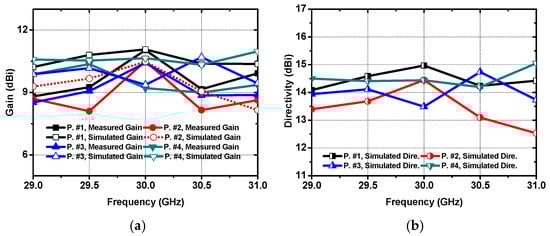 After addressing the measured data of radiation patterns, the measured gains can be calculated and compared to the simulated results, as shown in Figure 16. Also, the simulated directivity is provided to analyze the BFN loss. In the center frequency of 30 GHz, the simulated gains of the pattern are 11.0 dBi, 10.5 dBi, 9.4 dBi, and 10.6 dBi, respectively, related to port #1 = #4 excitations. Due to the grating lobe level increase, the gain of the beam corresponding to port #3 excitation is lower than that of other port excitations. An acceptable agreement can be viewed between simulated and measured gain. There is a difference of approximately 1 dB between the simulated directivity and gain. As mentioned in Section 2, the insert loss of the BFN is 0.8 dB. Additionally, the SIW to microstrip transition line has brought a 0.2 dB insert loss as well. In other words, the efficiency of the proposed multibeam antenna is approximately 80%.