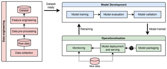 The use of Machine Learning (ML)-based applications and solutions is now integral to addressing a wide array of contemporary challenges, transforming numerous fields. For instance, ML models are critical for diagnosing diseases from medical images in healthcare [] and for enabling perception in autonomous driving []. Furthermore, their impact is seen in the financial sector for identifying fraudulent transactions [] and in e-commerce for powering personalised recommendation systems []. To meet the increasing demand for these ML-powered solutions, it is crucial to accelerate the development and deployment of ML models. In recent years, Machine Learning Operations (MLOps) [] has emerged as a popular approach for automating and streamlining the entire ML lifecycle, from model development to production deployment.