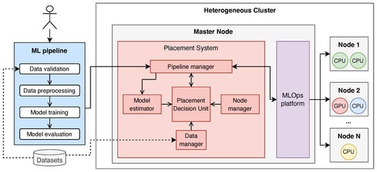Proposed solution architecture. The proposed system (red box) acts as an intermediary between the user and the MLOps platform (purple box). It receives an ML pipeline (blue box), which the Pipeline Manager breaks into individual tasks for analysis. Based on the solution components, the Placement Decision Unit determines an appropriate node for each pipeline task, as well as the execution order of the received pipelines. Finally, the Pipeline Manager delegates the pipeline to the MLOps platform, which executes it on the selected nodes.