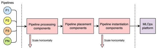 As illustrated in Figure 4, the system’s modular architecture and loosely coupled components enable it to scale horizontally by deploying multiple instances of each module. This design promotes a clear separation of concerns, ensuring that no single component becomes a performance bottleneck as the number of pipelines increases. For example, to support a higher rate of pipeline submissions, multiple Pipeline Manager instances can be instantiated, each responsible for managing a subset of pipelines. The unique component that does not scale horizontally is the Placement Decision Unit, as it needs to maintain a global view of the pipelines to make informed placement decisions.