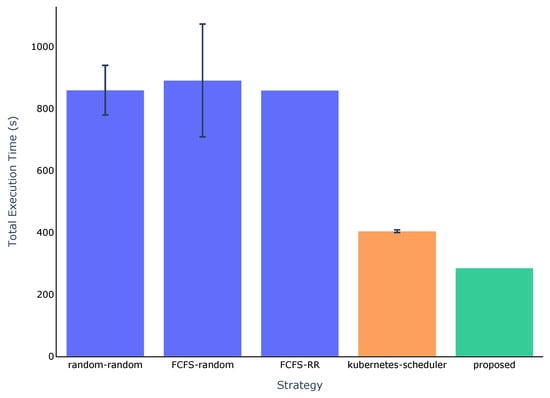 According to this table, the proposed strategy was approximately three times faster than the baseline approaches and 1.42 times faster than the Kubernetes scheduler. This translates to a reduction in total execution time between 66.82 percent and 68.01 percent compared to the baselines, and a reduction of 29.49 percent relative to the Kubernetes scheduler.