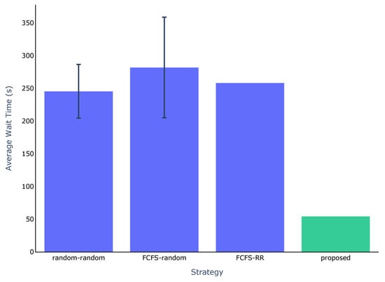 A similar pattern appears when examining the average waiting time. As shown in Figure 7, the proposed strategy resulted in the lowest average waiting time, with a value of 54.3 s. In comparison, the baseline strategies exhibited substantially higher average waiting times, ranging from 245.5 to 281.9 s. As detailed in Table 9, this represents a reduction in average waiting time between 77.88 percent and 80.74 percent, which corresponds to a speed-up factor between 4.52 and 5.19.