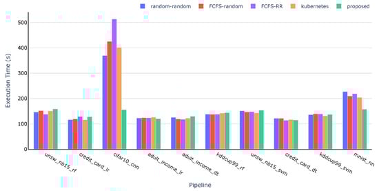 As shown in Figure 8, the execution times for pipelines that do not involve NNs are similar across all strategies. While the differences are not significant (maximum of 21 s), the Kubernetes scheduler occasionally achieves slightly better performance. This is primarily because all the tasks were placed on medium and high-performance nodes, leaving all low-performance nodes unused. However, this behaviour may lead to performance degradation for more complex pipelines, as the scheduler often concentrates workloads on the most capable nodes, resulting in resource contention and longer execution times.