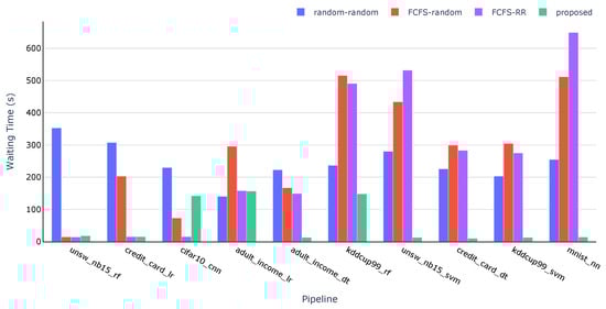 The importance of selecting appropriate nodes and adopting a scheduling technique becomes evident when comparing the proposed strategy with the FCFS-RR strategy. In the latter, the most computationally demanding pipeline (“cifar10_cnn”) was assigned to a medium-performance node, resulting in a cascading delay that increased the waiting times for all subsequent pipelines.