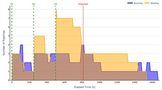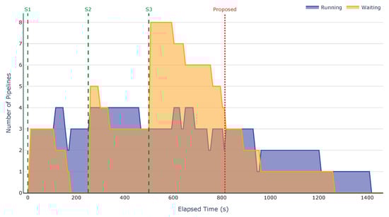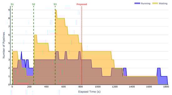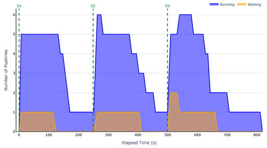 As in the previous scenario, the accumulation of waiting pipelines results in a cascading effect, where the number of pending pipelines increases with each submission. This behaviour is particularly evident in Figure 12, where the number of waiting pipelines starts at four, rises to six after the second submission, and reaches nine after the third, negatively impacting the overall execution time.