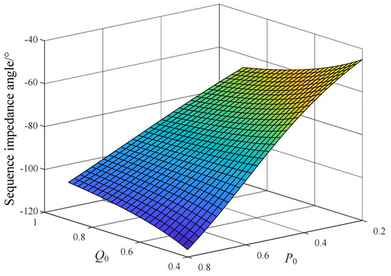In the case of a positive-sequence voltage amplitude U1 = 0.6 p.u., Figure 2 shows the phase angle of the positive-sequence impedance of both power sources in a two-terminal weakly fed AC system when the reference values of active and reactive power change. As evident from the graphical representation, the phase angle of the positive-sequence impedance exhibits a dynamic variation in response to changes in active and reactive power reference values, thereby precluding its characterization as a constant impedance parameter.