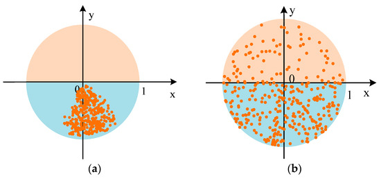 The positive-sequence impedance fluctuation angle and negative-sequence impedance fluctuation angle were substituted into the above equation and converted into a circle with radius of 1 and solved by MATLAB R 2018 b to obtain Figure 3. When a fault occurs, the relationship between the actual fluctuation region and the allowable fluctuation region of ZM1 and ZM2 is shown as the following figure, where the orange point is the actual possible fluctuation point of ZM1 and ZM2; the upper half circle is the correct operation area, that is, the allowed fluctuation area; and the lower half circle is the false operation area.