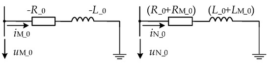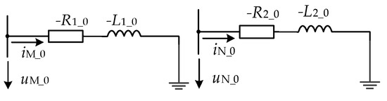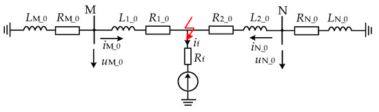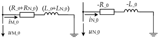 According to Formula (12), when the ground fault occurs in the positive direction of the directional element, the fault model that meets the zero-mode current and zero-mode voltage measured at the protection installation is the series model of negative resistance and negative inductance, as shown in Figure 5.