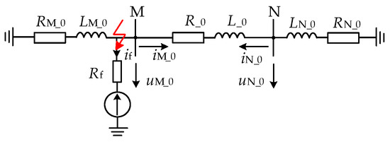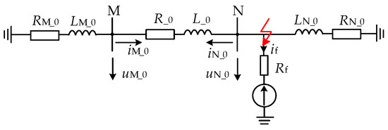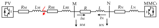 When a fault occurs at f5, the directional element is a positive fault on the photovoltaic side and a reverse fault on the MMC side. A single-phase equivalent model is presented for the ease of analysis in Figure 14.