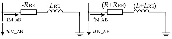As can be seen in Formula (13), when the ground fault occurs in the positive direction of the directional element, the fault model of the zero-mode current and zero-mode voltage measured at the protection installation satisfies the series model of negative resistance and negative inductance; when the ground fault occurs in the opposite direction of the directional element, the zero-mode current and zero-mode voltage measured at the protection installation satisfy the positive resistance and positive inductance model, as shown in Figure 7.