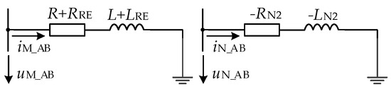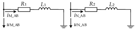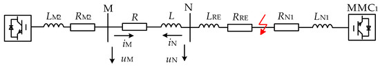 The AB phase fault in the simulation model in Figure 1 is taken as an example for analysis. When an AB phase fault occurs at f1, the directional element is a fault in the backward fault for the photovoltaic side and a fault in the positive direction for the MMC side. For the convenience of analysis, a single-phase equivalent model is presented in Figure 10.
