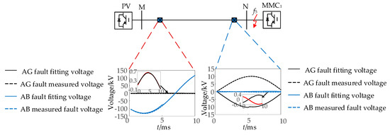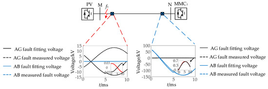 The waveform diagram of the fitted voltage and measured voltage for different outputs of PV when an A phase ground fault occurs at f1. (a) PV and (b) MMC.