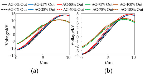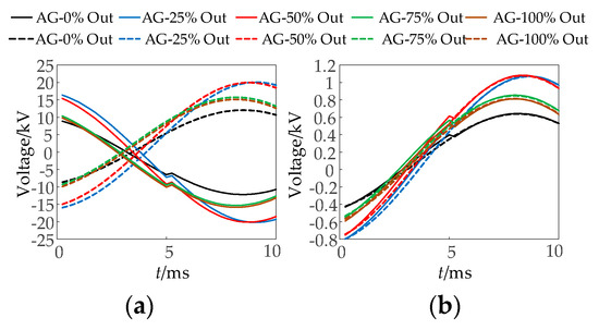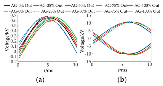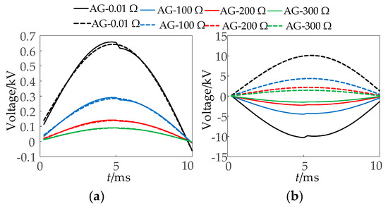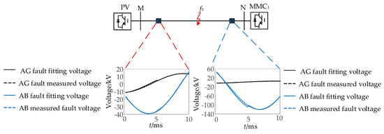 When ground faults and non-ground faults occur at different locations in the simulation model, as shown in Figure 1, the relationship between the fitted voltage and the measured voltage obtained through the above analysis and calculation is shown in Figure 16, Figure 17 and Figure 18. As shown in Figure 16, Figure 17 and Figure 18, when faults occur at different locations, the fitting voltage is the same as the measured voltage when the fault is in the positive direction, while the fitting voltage is the same as the measured voltage when the fault is in the opposite direction, which is consistent with the theoretical analysis mentioned above.