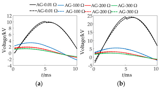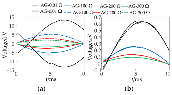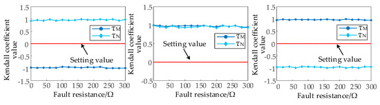 As shown in Figure 20, Figure 21, Figure 22 and Figure 23 and Table 2, when the fault occurs at different fault locations and AG is short-circuited by the transition resistance, the Kendall coefficient value between the fitted voltage calculated by the integrated directional elements and the measured voltage is consistent with the model average error, and the proposed directional elements can reliably identify the direction. The directional elements presented in this paper can still operate reliably under a 300 Ω transition resistance.
