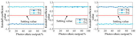 This study evaluates photovoltaic generation impacts on directional protection by simulating ground faults at points f1, f3, and f5 (Figure 1) under varying PV outputs (0–100% capacity), including zero-output nighttime conditions. Voltage measurement comparisons (fitted vs. actual values) are presented in Figure 24, Figure 25 and Figure 26, while Figure 27 displays the corresponding Kendall correlation coefficients. Table 3 summarizes directional identification accuracy across five output levels (0%, 20%, 50%, 75%, and 100%).
