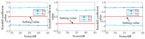 This study investigates noise interference effects (25–45 dB range) on directional protection components through ground fault simulations at points f1, f3, and f5 (Figure 1). Figure 28 presents the Kendall correlation coefficients quantifying the measurement consistency under noise conditions, while Table 4 details the directional discrimination accuracy at specific noise levels (25 dB, 35 dB, and 45 dB).