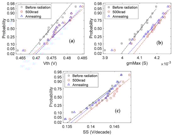 (a) Vth, (b) Gm-max (c) SS distribution of DUTs before radiation, after 500 krad radiation and after annealing.