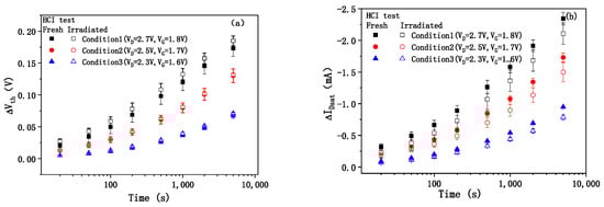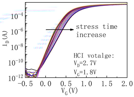 The hot-carrier test conditions for samples subjected to total dose rate irradiation, post-irradiation annealing, and non-irradiated samples are identical. For each sample under each test condition, five devices are subjected to the hot-carrier test, with a test duration of 5000 s. The I-V characteristics of the NMOS devices are measured using the Keysight 1500 A Semiconductor Device Parameter Analyzer (Keysight Technologies, Santa Rosa, CA, USA). The Keysight 1500 A offers voltage measurement accuracy at the 1 μV level and current measurement accuracy at the 1fA level.