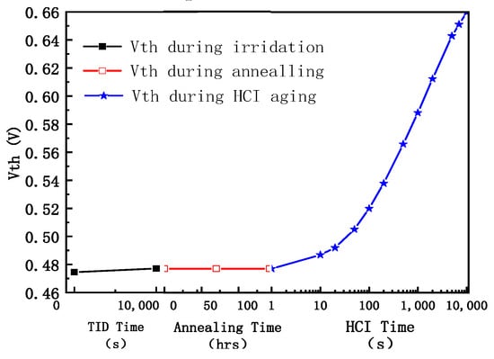 The Vth variations during irradiation, annealing, and hot-carrier tests are illustrated in Figure 4. The results show that the Vth of the NMOS device is insensitive to TID irradiation, with minimal changes induced by irradiation (ΔVth ≈ 2.6 mV, as shown in Figure 2a). However, during the hot-carrier test, the threshold voltage increased rapidly. At HCI condition 1, the Vth rose from 0.4771 V to 0.6598 V after 10,000 s of hot-carrier stress, resulting in a ΔVth = 182.7 mV. This shift is significantly higher than the average ΔVth caused by TID irradiation (2.6 mV), highlighting the severe degradation under hot-carrier stress compared to irradiation effects.