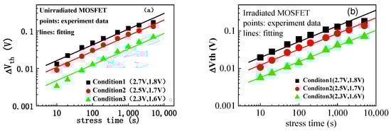 Using the least squares method, a global fitting is performed based on Equation (1) for the degradation data for unirradiated devices under three stress voltages (VD,stress = 2.7 V, 2.5 V, 2.3 V), yielding the degradation time exponent C = 0.42 in Equation (2), as shown in Figure 6a.