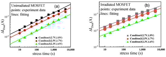 By fitting the average ΔIDsat values of irradiated and non-irradiated devices (as shown in Figure 7), the hot-carrier degradation model for ΔIDsat in non-irradiated devices is derived as follows: