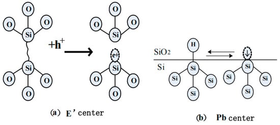 During TID irradiation of NMOS devices, the structural degradation of the gate oxide layer near the Si-SiO2 interface initiated with the dissociation of Si-Si bonds, creating dangling bonds that preferentially trapped holes to form E’ centers (Figure 8a). These E’ centers functioned as stable positive oxide trap charges due to their unpaired electrons localized at oxygen vacancy sites. Subsequent hot-carrier injection testing revealed a dynamic interplay between these trapped holes and injected hot electrons: the energetic electrons neutralized the trapped holes in dangling bonds, leading to a net reduction in positive charge within the oxide layer. This charge imbalance directly contributed to a measurable positive shift in threshold voltage, reflecting the cumulative impact of oxide trap charge modulation on device electrostatics.