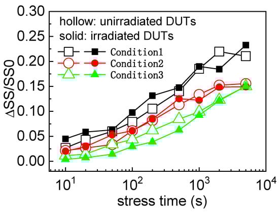 ΔSS/SS0 of HCI tests between irradiated and unirradiated NMOSFET.