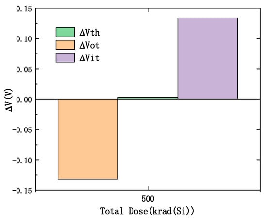 The values of ΔVth, ΔVot, and ΔVit after irradiation with a total dose of 500 krad (Si).
