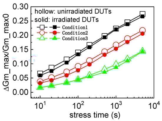 Since electron mobility varies less in irradiated devices compared to unirradiated devices, this also results in a similar pattern for the maximum transconductance (Gm-max). Figure 11 shows the variation in the ratio between the change in subthreshold maximum transconductance (ΔGm-max) and the pre-stress maximum transconductance (Gm-max0) with stress time under three hot-carrier injection stress conditions. It can be seen from the figure that all three HCI stress conditions exhibit a consistent trend: the ΔGm-max/Gm-max0 value for irradiated devices is smaller than that for unirradiated devices.