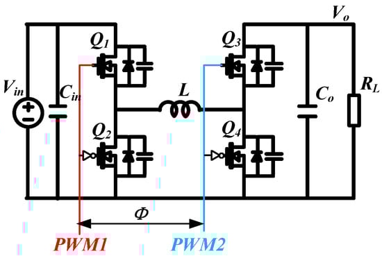 In applications such as intermediate bus converters of data centers, photovoltaic energy storage systems, and electric vehicles [1,2,3,4], non-isolated dc-dc converters are usually required to have the ability to step up and step down due to the wide variation of input and output voltages and the overlapping voltage range. The four-switch buck–boost (FSBB) circuit can not only meet the requirements for wide-range step-down and step-up but also features fewer passive components and high-frequency ZVS operation. As shown in Figure 1, the FSBB converter has four switches, Q1, Q2, Q3, and Q4, which form the leg of the input side and the leg of the output side. Among them, the MOSFET Q1 and Q2 on the input side are controlled by PWM1, whose control variable is defined as the duty cycle d1. The MOSFET Q3 and Q4 on the output side are controlled by PWM2, whose control variable is defined as d2. The phase shift between PWM1 and PWM2 is defined as Φ, which is the third control dimension for the converter. Since the control of the FSBB circuit has three degrees of freedom, making it more flexible and complex, many control strategies for the FSBB have been proposed to achieve high efficiency and high-frequency operations. These can generally be divided into traditional hard-switch control and soft-switch control.