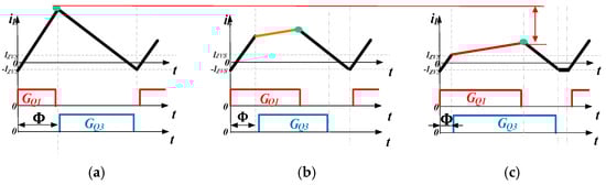 The traditional multi-mode hard-switching control has buck mode, boost mode, and buck–boost mode [5,6]. Through the detection and comparison of input and output voltages, only the PWM1 of the input side leg is controlled, and the duty cycle of the output side leg (d2) equals 1 when operating in the step-down mode. Similarly, when operating in the step-up mode, d1 = 1, and only the PWM2 of the output side leg is controlled. When the input and output voltages are close, both the input and output side legs are controlled. This control strategy has a large peak-to-peak current value and high switching loss, especially when operating in buck–boost mode with twice the number of switch operations compared to buck or boost modes. In order to reduce the peak-to-peak and RMS values of the inductor current, papers [7,8] proposed a three-mode double-edge modulation strategy, which transformed the triangular inductor current wave into a quadrilateral waveform, thereby improving the efficiency. However, since the current is always continuous, the losses of the hard-switching limit the switching frequency and power density.