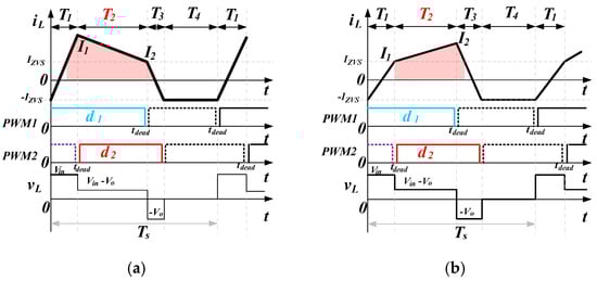 To address losses of the hard-switching and achieve high-frequency soft switching, reference [9] presented a strategy where the inductor current crosses zero, as shown in Figure 2a. The PWM1 and PWM2 satisfy d1 = 1 − d2. Thus, zero-voltage switching can be achieved during the dead time, which greatly reduces the switching loss in high-frequency operation. However, due to the large peak-to-peak and RMS values of the triangular current waveform, the conduction loss and turn-off loss increase.