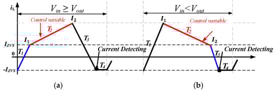 The digital CSC strategy and proof of the minimum RMS value of inductor current control have been presented in Reference [14]. In conclusion, as shown in Figure 3, to realize the minimum volt-second of the inductor, the proportion of T2 in the whole cycle should be as large as possible to reduce the peak and RMS values of the inductor under the constraints of the given operating conditions. As shown in Figure 5, when Vin > Vout, the constraint condition for the minimum RMS of the inductor current can be simplified as I1 = Izvs, and T2 is the only control variable for closed-loop regulation, which is determined by the PI controller. Thus, the MCU just calculates T1 using (6). The end of T3 can be detected by the comparator. When Vin < Vout, the only difference is that I2 = Izvs, which means the value of T3 is given by Equation (7). Therefore, it is sufficient to calculate T1 in advance using the volt-second balance of the inductor, as expressed in Equation (8). In conclusion, there is only one control variable (T2) in the digital high-frequency soft-switching CSC strategy, which brings great convenience for small-signal modeling and closed-loop system design.