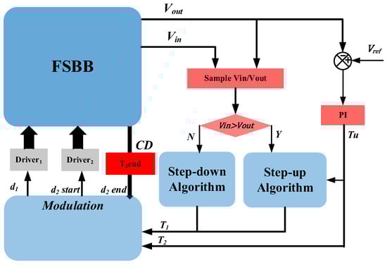 The whole closed-loop system of the FSBB converter under the digital high-frequency soft-switching CSC strategy is presented in Figure 6. The digital controller samples the input and output voltages through the ADC and determines whether the step-up algorithm or the step-down algorithm should be used to calculate T1 in real time. At the same time, according to the error between the output voltage Vout and the reference value Vref, the control variable Tu is given by the PI, which is the only control variable used in the simplified digital high-frequency soft-switching CSC strategy FSBB circuit. Then, the control parameter T1 obtained by the simplified algorithm and T2 = Tu will be transformed into d1, d2, and the phase shift by the modulation part, which is used to drive the switches of the FSBB circuit.
