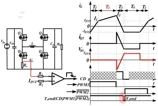 In order to reset the inductor current cycle by cycle, as shown in Figure 7, the resistor Rs converts the current of Q2 into a voltage signal VRS, which contains the monitoring points of the inductor current. Then, VRS is passed to the input of the comparator together with the reference current Izvs to determine the end time of T3. When VRS reaches the value Izvs during T3, as shown in Figure 7, the comparator output signal CD will be pulled down. However, the switching transitions induce oscillations and overshoots that could affect the detection. As a result, the comparator usually generates multiple wrong falling edges caused by switching transitions. Thus, the drive signals and are used to shield against wrong edges. As shown in Figure 7, since and are both 1 (high level), except at T3, and both 0 (low level) at T3, the falling edge of the CD signal at T3 can be extracted by the OR operation with . In actual implementation, the falling edge of will also be appropriately delayed to shield switching transitions at the end of T2. In conclusion, all the switching transition moments have been shielded by OR operation with . During T3, there is no switching operation until the CD is pulled low, and the processed signal can be obtained using a three-input OR gate, expressed as the Boolean equation .