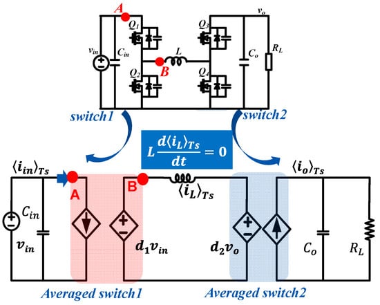 Since the use of a comparator to detect the inductor current under the digital high-frequency soft-switching CSC strategy, the inductor current does not have a free boundary, unlike other controls without current detection. As shown in Figure 8, the moving average of the inductor voltage seems to be equal to zero or approximately zero since Equation (9) always holds true. The current detection resets the boundary of the inductor current cycle by cycle, and does not behave as a state-space variable anymore. Then, the state-space equation of the inductor current is transformed into a constraint Equation (9). Thus, the small-signal model of the FSBB converter under the digital high-frequency soft-switching CSC strategy can reduce the order for the convenience of the closed-loop design. There is only one state-space variable remaining, which is the voltage of the output capacitor Co. The averaged switch network of the FSBB converter is shown in Figure 8. Each switch network can be represented by a dependent voltage source and a current source using three-terminal switching network models.