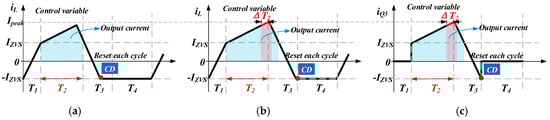 As shown in Figure 9a,b, the averaged inductor current is controlled by T2, which is no longer a state-space variable but is directly obtained from the algorithm of the constraint function in Equations (6)–(8). The control variable is incremental , given by the PI controller, and will directly influence the moving averaged value of the output current, which is represented by the shadow area.